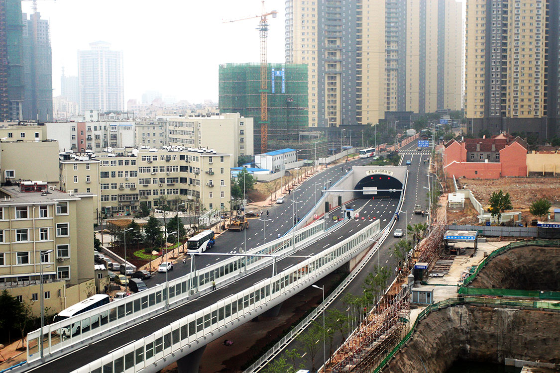 膠州灣灣口海底隧道青島端接線工程南起膠州灣灣口海底隧道青島端終點(diǎn),分別沿四川路、云南路向北,在東平路路口爬升地面后開(kāi)始高架,于山西路路口上方合流后接入快速路三期工程。