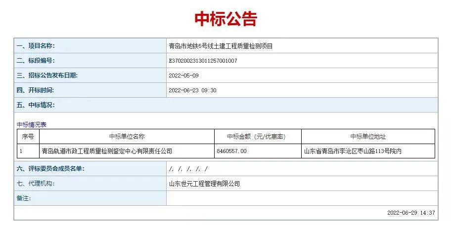 近日,城市物業(yè)所屬青島軌道市政工程檢測鑒定中心中標(biāo)“青島市地鐵5號(hào)線土建工程質(zhì)量檢測項(xiàng)目”,中標(biāo)金額8460557元,公司檢測業(yè)務(wù)實(shí)現(xiàn)新突破。