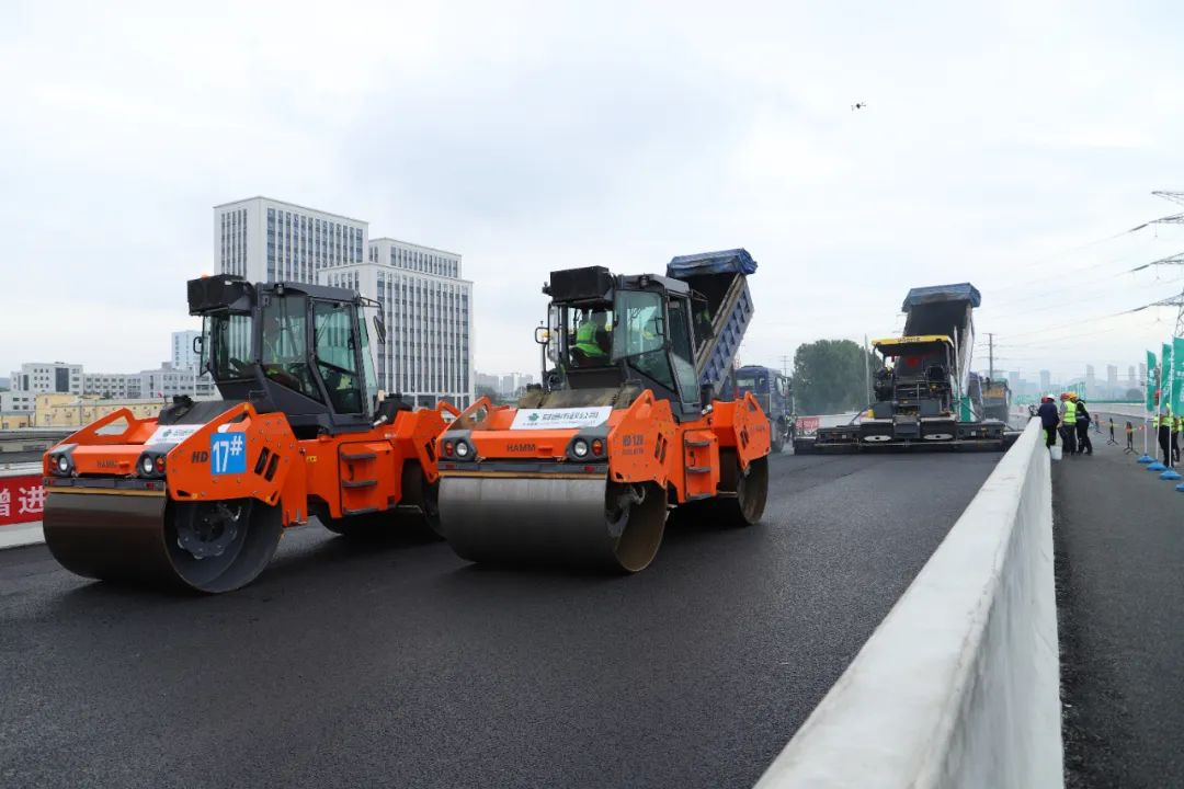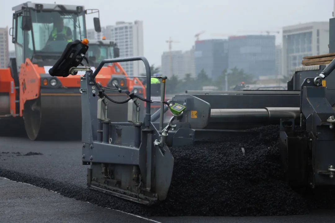 5月29日,在跨海大橋高架路二期工程二標段項目瀝青面層攤鋪現(xiàn)場,兩臺無人操作的攤鋪機正緩緩前行,數(shù)臺壓路機來回碾壓著路面,隨著面層瀝青混合料均勻攤鋪在底層上,背后一條嶄新的市區(qū)快速路向遠處延伸。